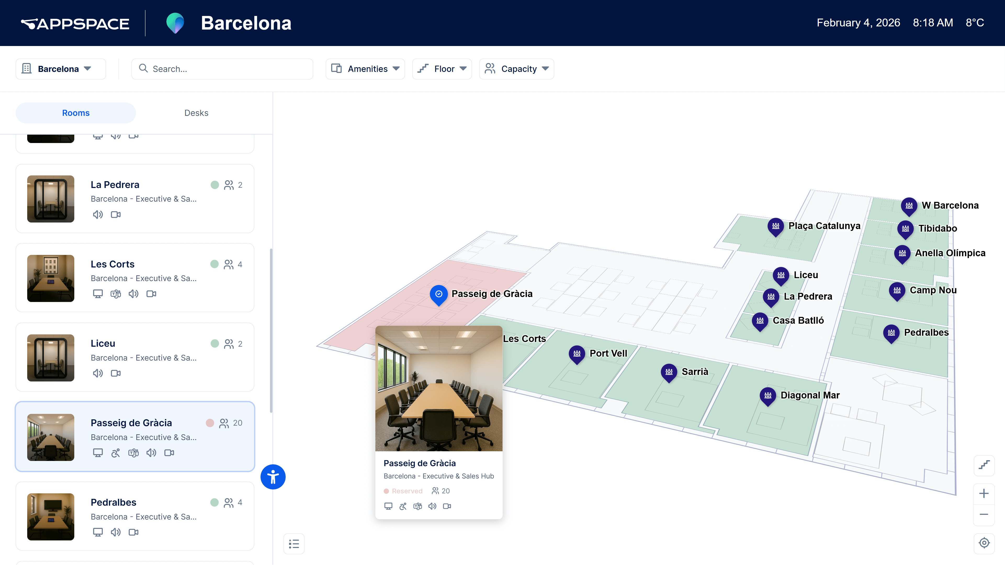 You can see what spaces exist, where they are, and how they are organized. The data comes straight from Microsoft Places and is surfaced in a simple, walk‑up experience on an Appspace kiosk.